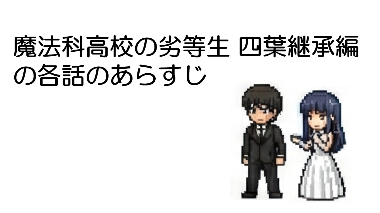 | 14 | 達也の能力 | 新年の集いの前夜、真夜は継承候補者たちと会食を行う。そこで文弥と夕歌は深雪を次期当主として支持し、自身の立候補を取り下げる。勝成もこれに続き、交換条件としてガーディアンである琴名との結婚を認めるよう求める。真夜は深雪に意味深な視線を送りつつ、愛し合う二人を引き裂くつもりはないとこれを承諾する。 |